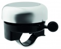 Fahrradklingel. Oberseite aus Aluminium mit eingelassenem silbernen Papierklebepunkt. Unterseite aus ABS.