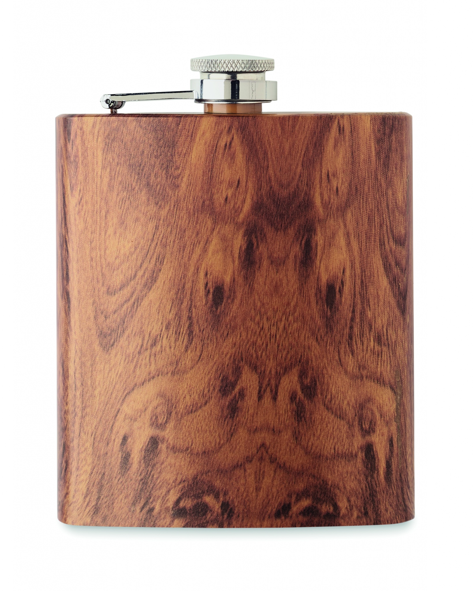 Flachmann aus recyceltem Edelstahl (90 % recycelter Edelstahl und 10 % Edelstahl) in Holzoptik. Füllmenge: 190 ml.