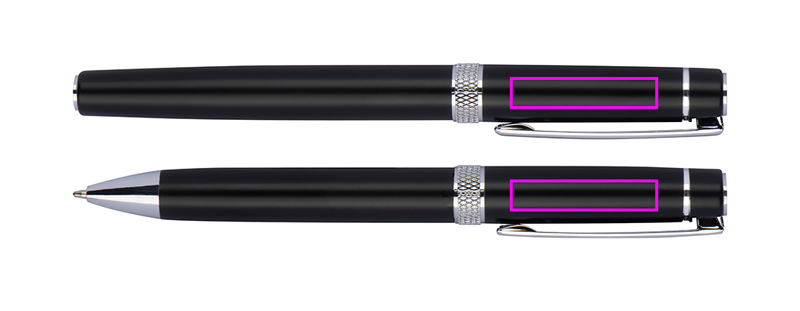 Schreibset bestehend aus einem Drehkugelschreiber mit blauschreibender Systemmine und einem blauschreibenden Rollerball aus Aluminium im Etui. Die Chromapplikationen und die funkelnden Zierringe verleihen dem Set seine edle Optik. Ihre Werbung wird auf beiden Stiften rechts neben dem Clip eingraviert.