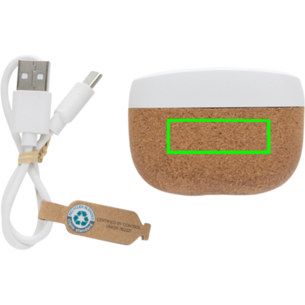 Elegante, kabellose Ohrhörer aus 100% FSC®-Kork und RCS (Recycled Claim Standard) zertifiziert recyceltem ABS. Recycelter Inhalt insgesamt: 35%, bezogen auf das Gesamtgewicht des Artikels. Die RCS-Zertifizierung gewährleistet eine vollständig zertifizierte Lieferkette der recycelten Materialien. Die perfekt sitzenden Ohrhörer verfügen über einen 35mAh-Akku und können im 300mAh-Lade-Case innerhalb von 1,5 Stunden wieder aufgeladen werden. Mit automatischer Kopplungsfunktion, so dass Sie sie einfach mit Ihrem Mobilgerät koppeln können. Spieldauer bei mittlerer Lautstärke ca. 3 Stunden. Mit BT 5.3 für eine stabile Verbindung auf bis zu 10 Meter. Mit Anrufannahmefunktion und Mikrofon, sowie mit Silikon-Ohrstöpsel in 3 Größen. Inklusive RCS-zertifiziert recyceltem TPE-Ladekabel. Verpackt in FSC®-Mix-Kraftverpackung. Artikel und Zubehör 100% PVC-frei.