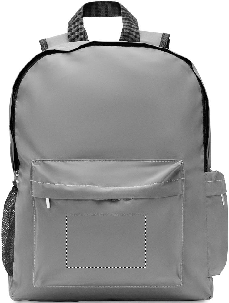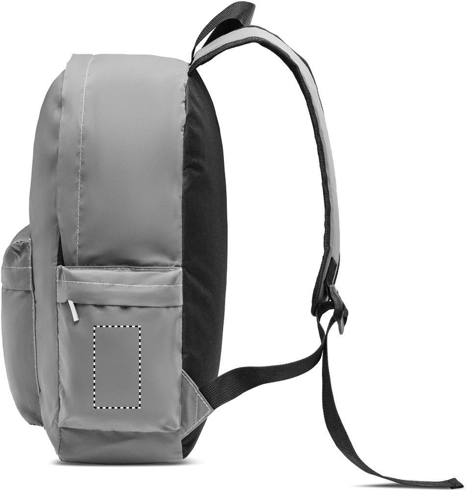 Rucksack aus reflektierendem 190T Polyester. Gepolstertes 15'' Laptopfach. Fronttasche, seitliche Tasche mit Reißverschluss sowie Netztasche. Gepolsterter Rücken aus recyceltem 600D Polyester.