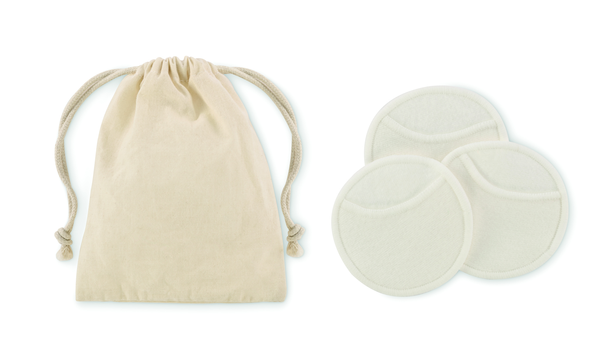 3 weiche, wiederverwendbare und waschbare Reinigungspads (Ø 8cm) aus 70% Bambusfaser und 30% Baumwolle. Lieferung im Baumwollbeutel mit Kordelzug.