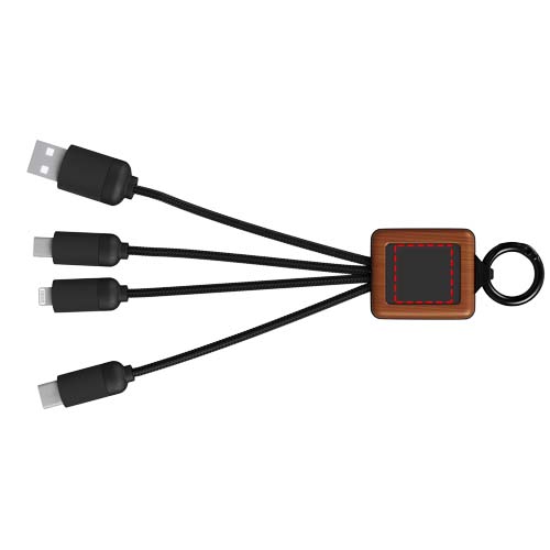 3-in-1 Kabel aus Holz mit leuchtendem Logo und 3 Anschlüssen (Typ-C/Micro-USB/iPhone), sowie Schnüren aus recyceltem PET-Kunststoff. Das Kabel kann bis zu 3 Geräte gleichzeitig aufladen. Patent EUROPE EUIPO.
