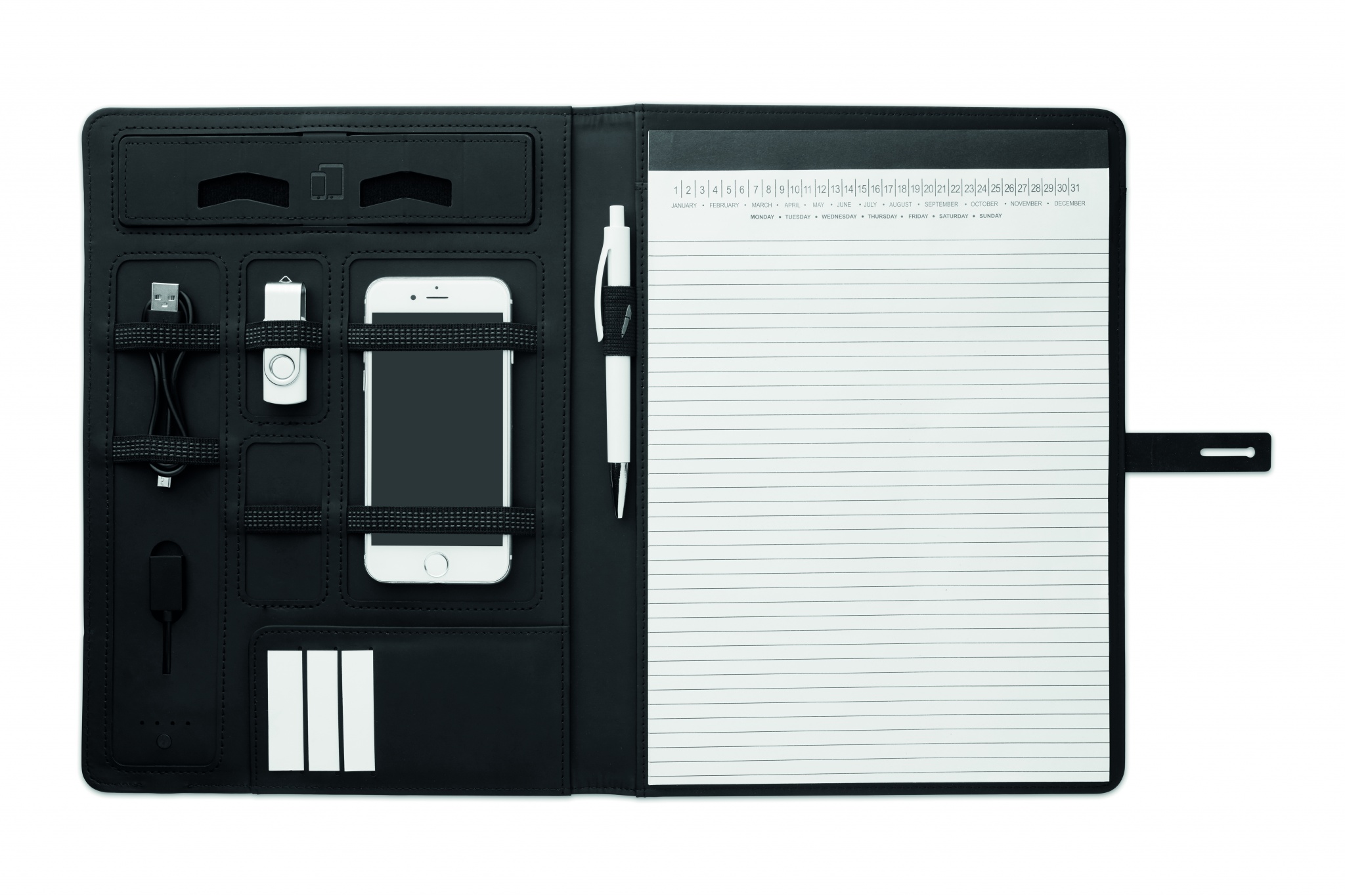 A4 conference folder portfolio in linen-PU with clasp closure. DC5V/1A wireless charging. 4000 mAh power bank with a micro USB to a type C connector. 20 lined sheets notpad. Card holder. Pen holder. Black aluminium plate ideal for your logo.