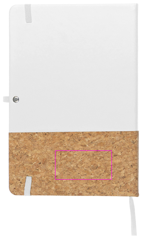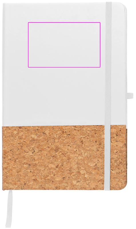 A5 notebook with 160 lined pages and PU cork cover, bookmark, ballpen loop, and elastic closure band. We print your logo on the front.