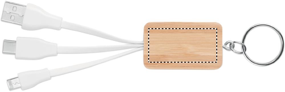 Bamboo cover key ring with charging cable with USB-A to Micro-B (2 in 1 pin) and Type C. Bamboo is a natural product, there may be slight variations in colour and size per item, which can affect the final decoration outcome.