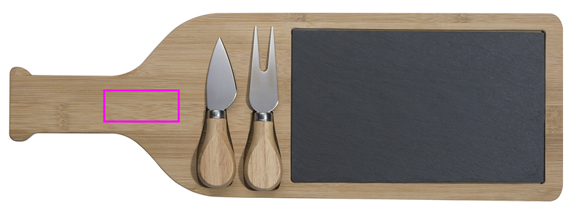 Cheese board made of bamboo in the form of a wine bottle with a slate that can be inserted, a cheese knife and a cheese fork. We engrave your logo onto the slate.