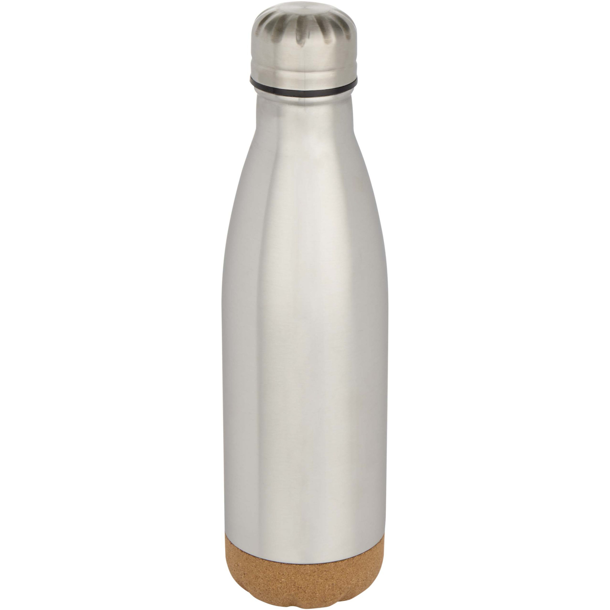 Vacuum insulated stainless steel water bottle with cork details at the bottom. The double-wall insulation keeps drinks hot or cold for several hours. Presented in a recycled cardboard gift box. Volume capacity: 500 ml.