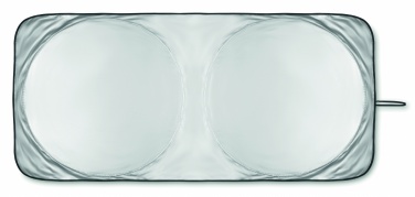 Foldable sun car visor in 170T polyester including pouch.