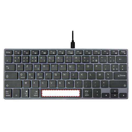 Lightweight yet durable and stylish keyboard (AZERTY layout with 78 keys) with aluminium housing. The keyboard supports Bluetooth® 4.0 for a stable connection and low power consumption, and is compatible with PC/laptop, tablets, mobile phones, smart TVs and other devices with Bluetooth® function. The operating distance is up to 10 meters, and the keyboard has a 350mAh built-in and rechargable battery. Delivered in a premium kraft box with a colourful sticker.