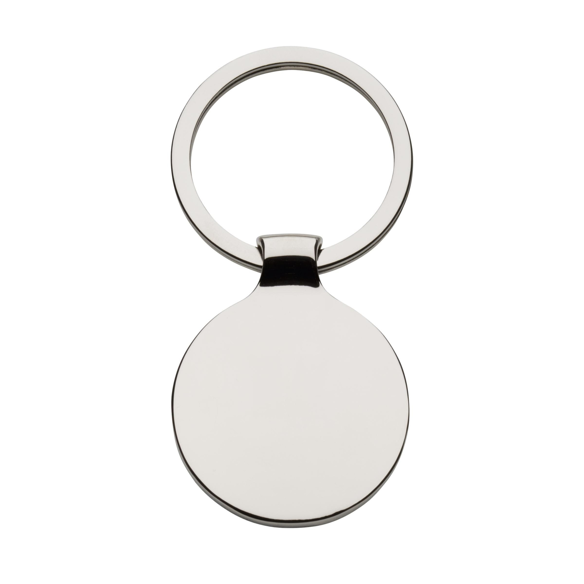 A round, polished, nickel metal keyring with black inlay and sturdy keyring. Each item is supplied in an individual brown cardboard envelope.