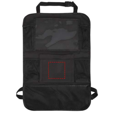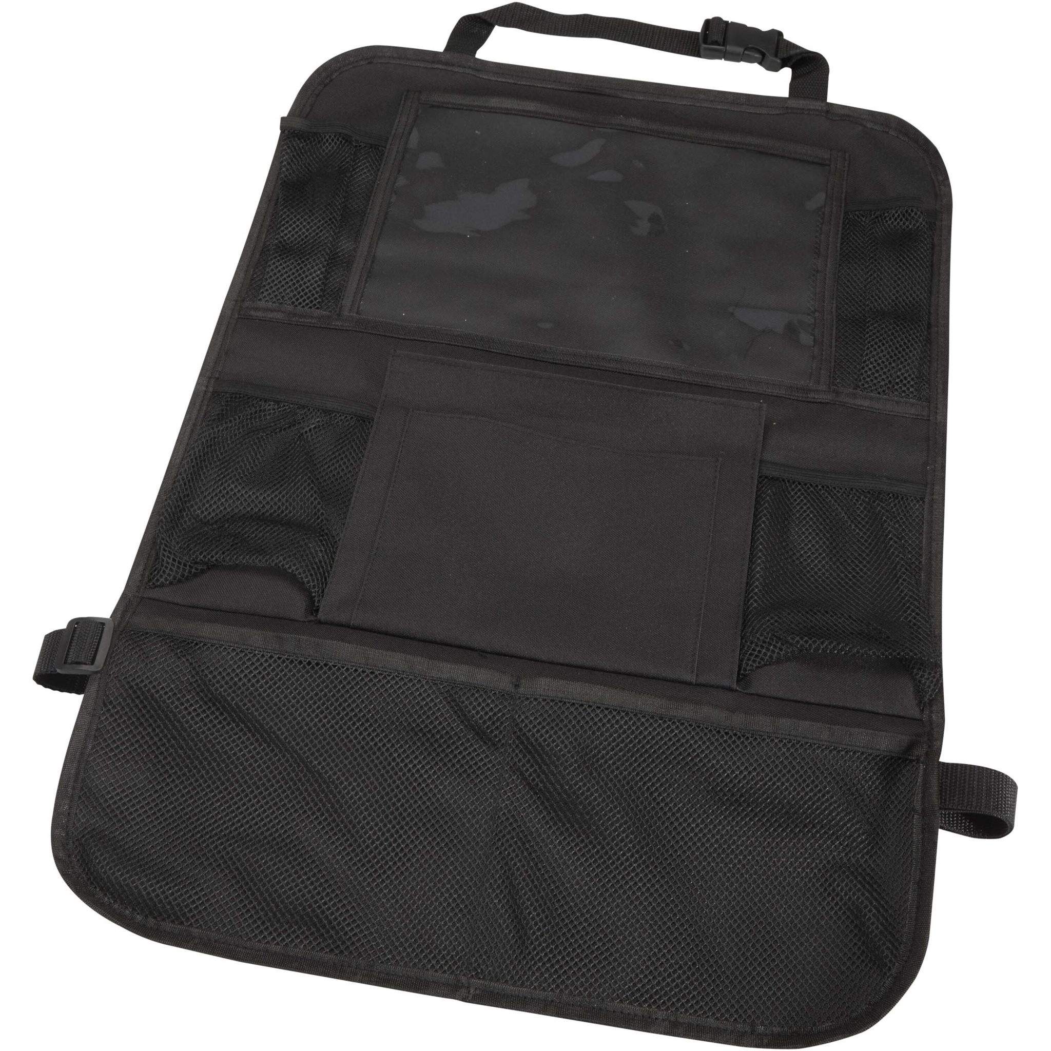 Car back seat organiser with multiple mesh pockets to hold essentials such as snacks, toys, or bottles, plus a PVC window for a tablet. It attaches easily to the front seat and helps keep your car tidy and clutter-free – ideal for families, road trips, or everyday use.