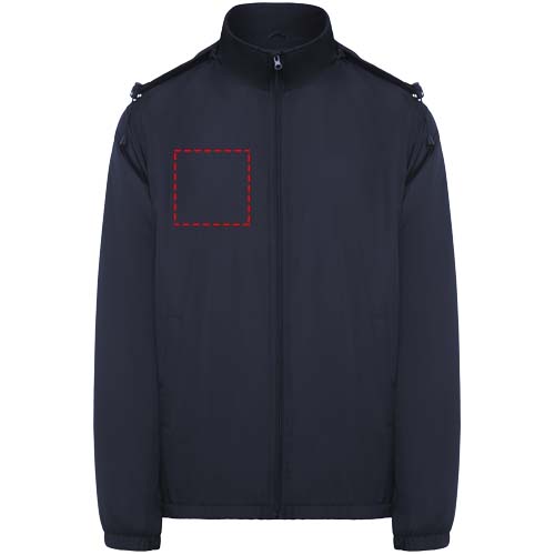 Light waterproof jacket. High collar and foldable hood with adjusters. Microfleece lining. Front zip and chin protector. Elastic cuffs. Two side pockets with zip. Interior left chest pocket. Removable label. Waterproof. Wind-proof. The male model is 184 cm and is wearing size L, and the female model is 174 cm and is wearing size S.