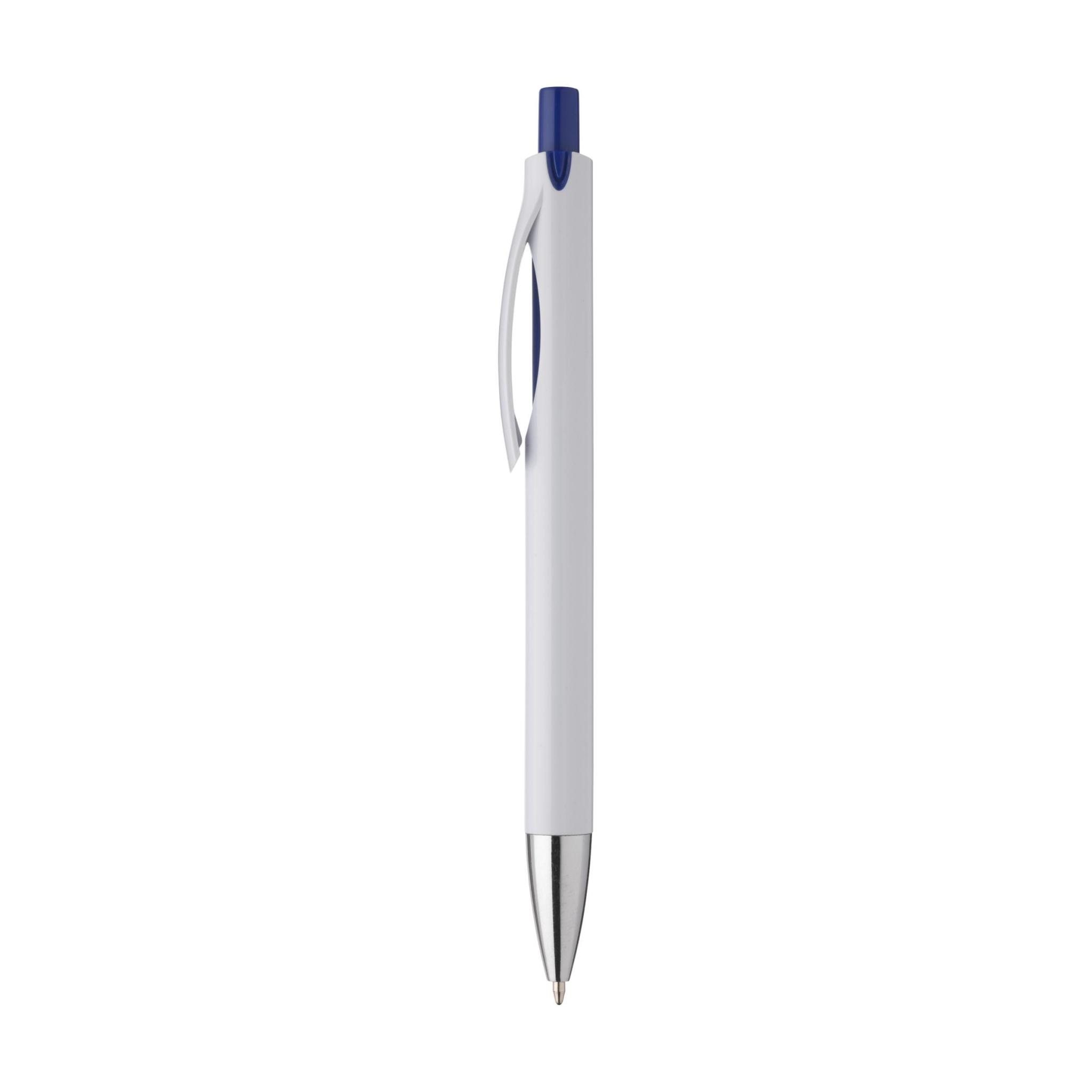 Blue ink ballpoint pen with stylish design: the body and clip of this pen are integrated. Striking colour accent below the clip. This accent colour matches the colour of the push button.