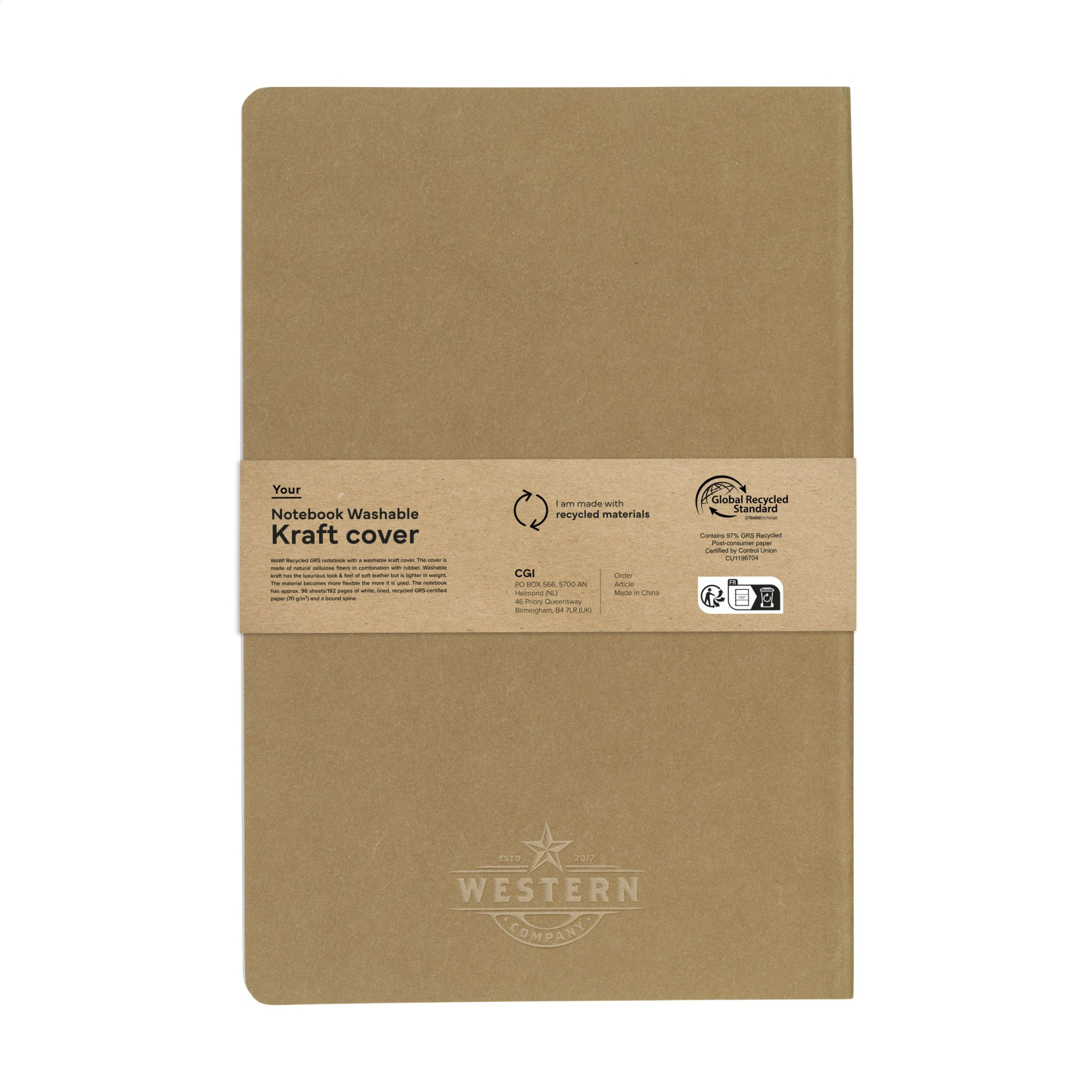 WoW! Recycled notebook in A5 format with a washable kraft cover. The cover is made from natural cellulose fibers in combination with rubber. Washable kraft has the luxurious look & feel of soft leather but is lighter in weight. The material becomes more flexible the more it is used. The notebook has approx. 96 sheets/192 pages of white, lined, recycled GRS-certified paper (70 g/m²) and a bound spine. GRS certified. Total recycled material: 97%.