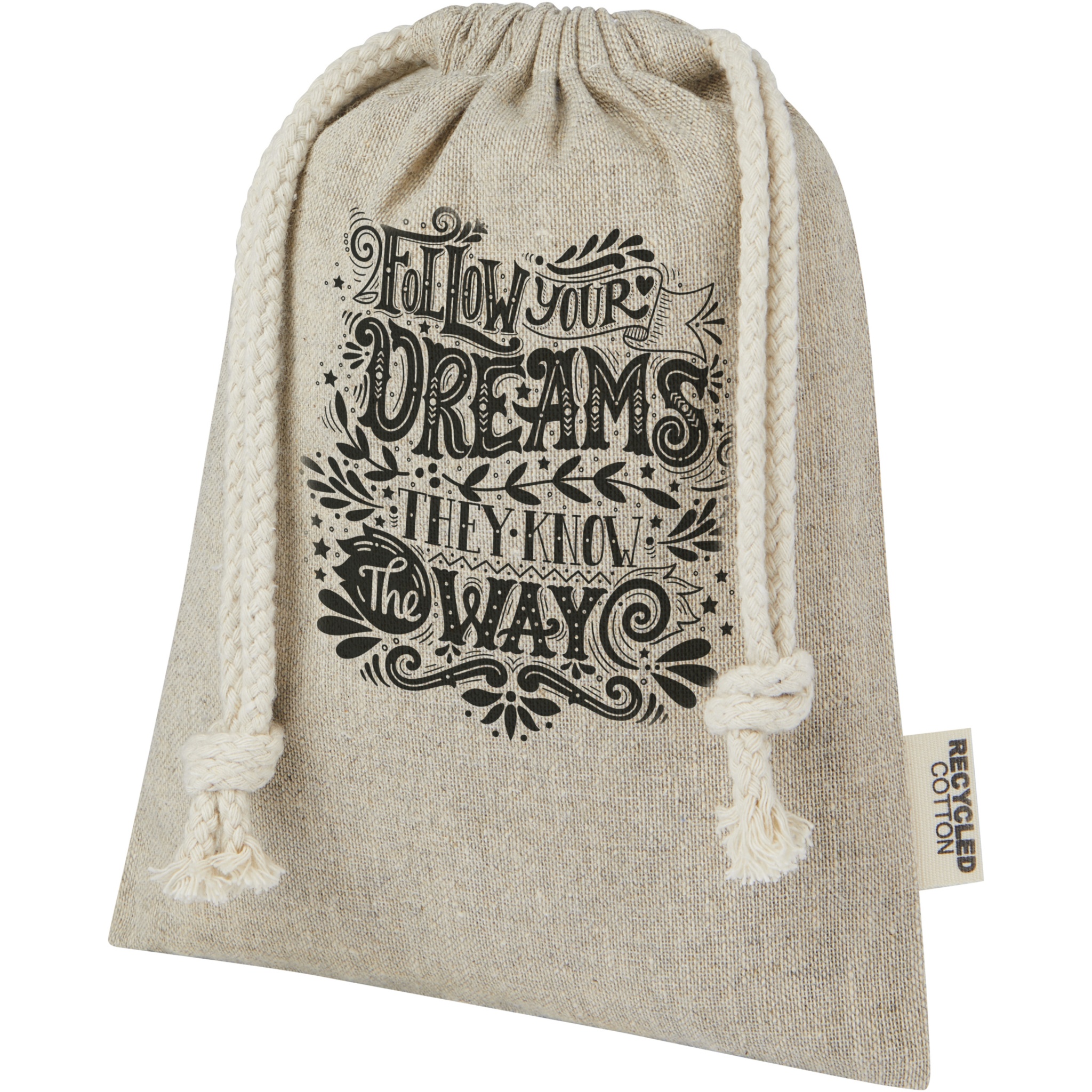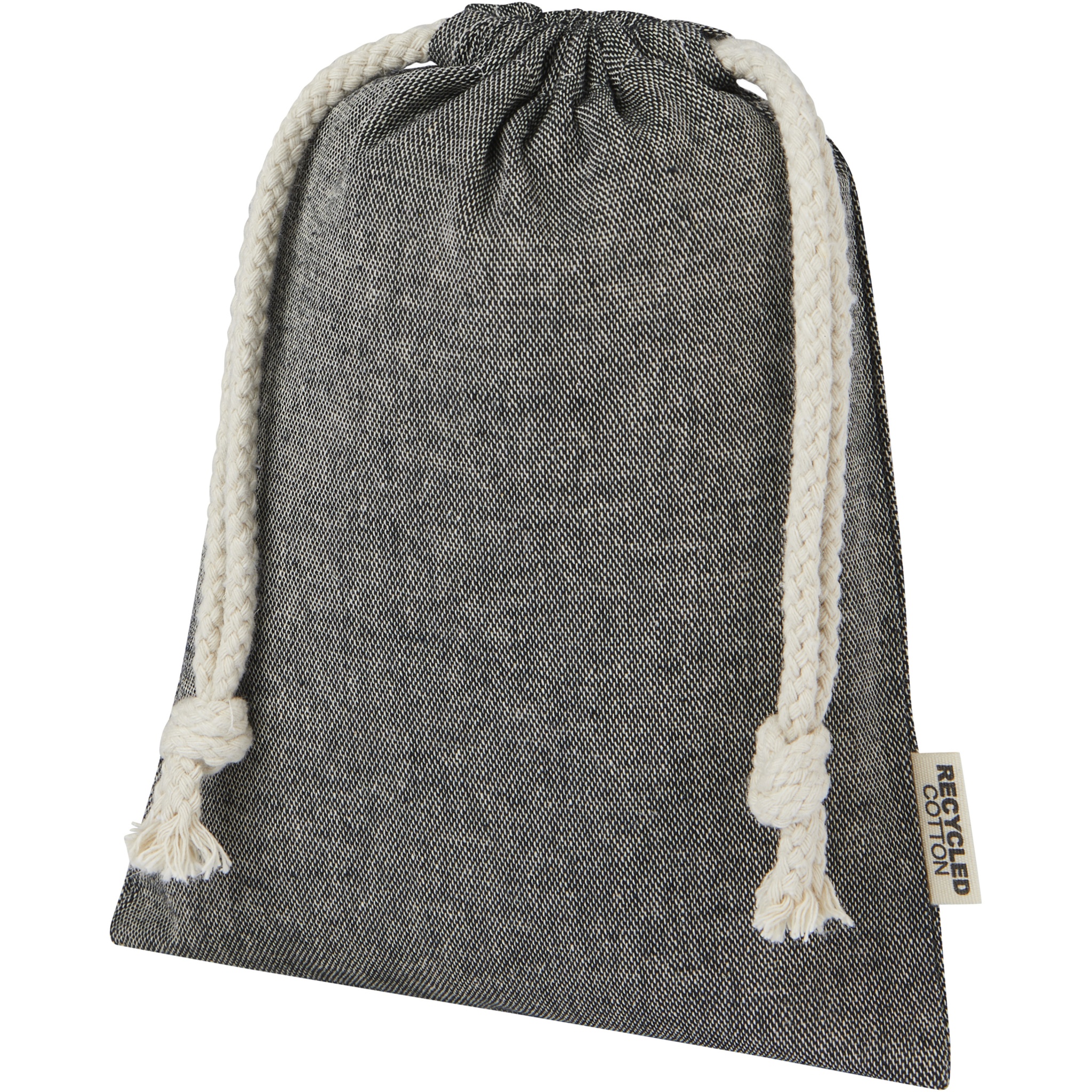 Gift bag made of GRS certified recycled cotton with cotton drawstring closure. Ideal for gifting or storing items. Size: 15 x 20 cm. There may be minor variations in the colour of the actual product due to the nature of the production process.