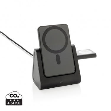 3-in-1 wireless charger with powerbank dock made with RCS, ABS and RCS recycled PC. When you are at home or work use the stand to charge your mobile devices. When you have to go somewhere simply take out the magnetic powerbank from the dock and click it on your phone. Total recycled content: 59% based on total item weight. RCS certification ensures a completely certified supply chain of the recycled materials. The wireless charger comes equipped with a magnetic 5W wireless charger and an additional 5W wireless charger suitable for earbuds cases or other small wireless chargeable devices and a 2.5W wireless charger for smartwatches ( Apple watches only). Including RCS certified 120 cm recycled TPE cable. Packed in FSC® mix packaging. Item and accessories 100% PVC free. Input: 5V/2.4A for optimal use. Output: Phone: 5V/1A Earbuds: 5V/1A, Watch: 5V/0.5A. PVC free.