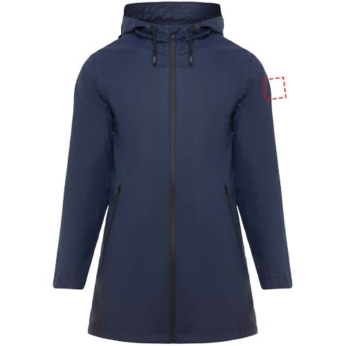 Waterproof raincoat for women. Hood with peak. Heat-sealed zips and seams. Contrasting details in black. Two side pockets with zip. Slit on back hem. Removable label. Waterproof. The model is 179 cm and is wearing size S.