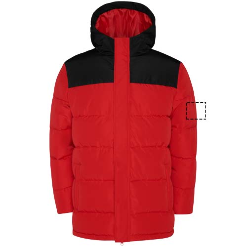 Padded jacket with fixed hood. Front zipper covered with a placket. Chin guard. Two side pockets with zip. Elastic cuffs.