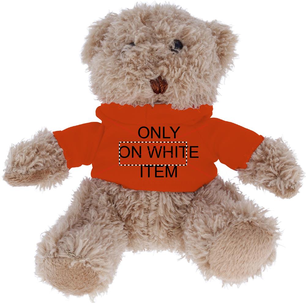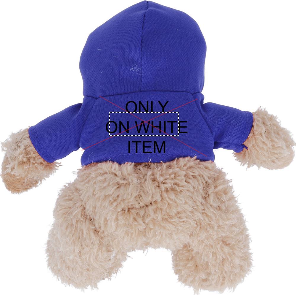 Teddy bear plush wearing a hooded sweater. Sublimation print available on white item only.