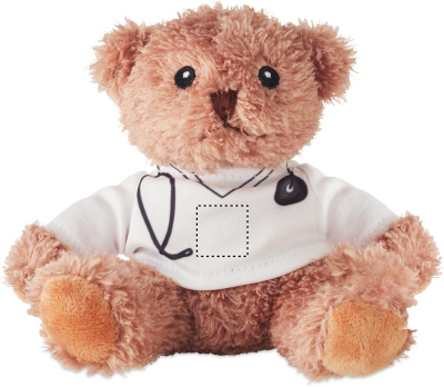 Polyester teddy bear plush dressed as a doctor with white printed T-shirt. Embroidered eyes, nose and mouth.