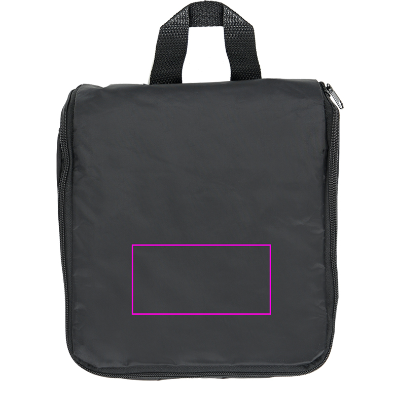 Our toilet bag recommendation! This is the right one! Made of robust nylon - inside with ample space, there is a transparent zipper compartment, a stretch band with 5 loops, 3 big net compartments and 2 net compartments with a metal hook, which you can take out by means of a Velcro fastener, for hanging up in the shower for e.g. shampoo or shower gel. The bag provides a 270 degrees surround zipper and one further metal hook for hanging it up. This is practical and convenient! We will print your logo on the front of the bag.