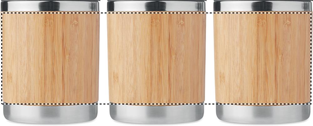 Double walled stainless steel tumbler with bamboo case and moveable drink hole. Capacity 250 ml. Bamboo is a natural product, there may be slight variations in colour and size per item, which can affect the final decoration outcome.