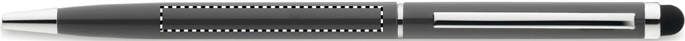 Twist action ball pen in aluminium with stylus and shiny chrome clip. Blue ink.