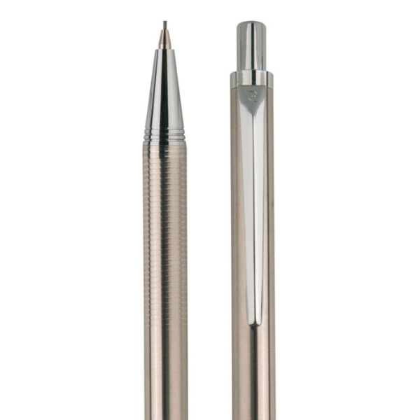 Luxury set of ballpoint pen and micro pencil Pierre Cardin in silver, aluminium body with simple clip, fine engraving at the surface of the grip. Ballpoint pen contains a quality blue refill with the tip 1 mm, micro pencil a graphite 0.5 mm. Packed in Pierre Cardin‘s luxurious pocket, comes with a certificate of authenticity.