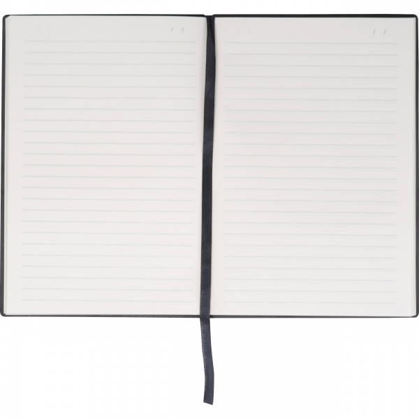 A5 märkmik painduva pehme PU-kaanega, järjehoidja ja 192 taaskasutatud paberist lehtedega. Teie logo trükitakse kaanele punutud ala alla.
