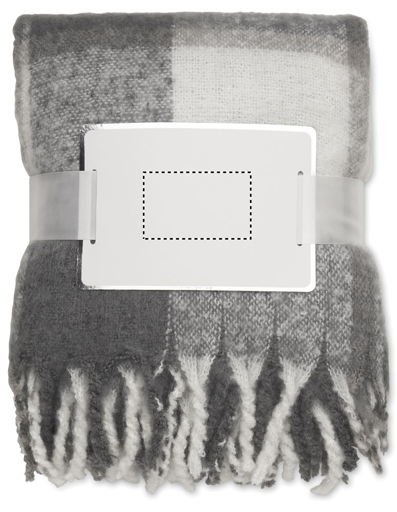 Ruudulise disainiga mohääri tunnetusega RPET polüestertekk käsitsi rullitud narmastega. Paelaga mähitud ja prinditav kaart.