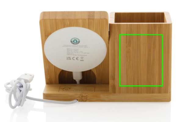 10W pikalaturi kynäpidikkeellä valmistettuna RCS (Recycled Claim Standard) sertifioidusta kierrätetystä ABS:stä. Kierrätetyn materiaalin kokonaismäärä: 6% perustuen tuotteen painoon (sisältäen bambupohjan). Bambuinen ulkokuori valmistettu FSC 100 bambusta. Sisältää 120 cm tyypin C latauskaapelin, joka on valmistettu RCS-sertifioidusta kierrätetystä TPE:stä. Pakattu FSC-sekoituksesta valmistettuun kraft pakkaukseen. Tyyppi C tulovirta: 5V/2A; 9V/1.67A. Langaton lähtövirta: 5V/1A/1.1A (10W) Rekisteröity design®