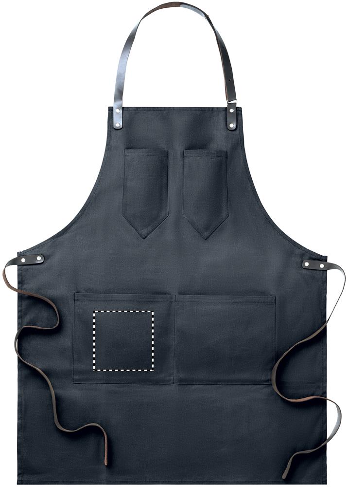 Esiliina vahattua kangasta, nahkaisilla yksityiskohdilla. Säädettävä hihna, 2 rintataskua ja yksi isompi tasku. 12 oz vahattua kangasta.