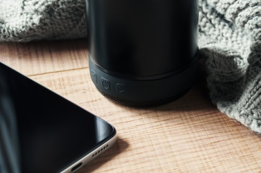 Kaksiseinäinen tyhjiöeristetty pullo kierrätetystä ruostumattomasta teräksestä (90 % kierrätettyä ruostumatonta terästä ja 10 % ruostumatonta terästä) ja silikoninen kantokahva, jossa on irrotettava 3 W langaton kaiutin. Tilavuus: 500 ml. 500 mAh akku. Vuotamaton.