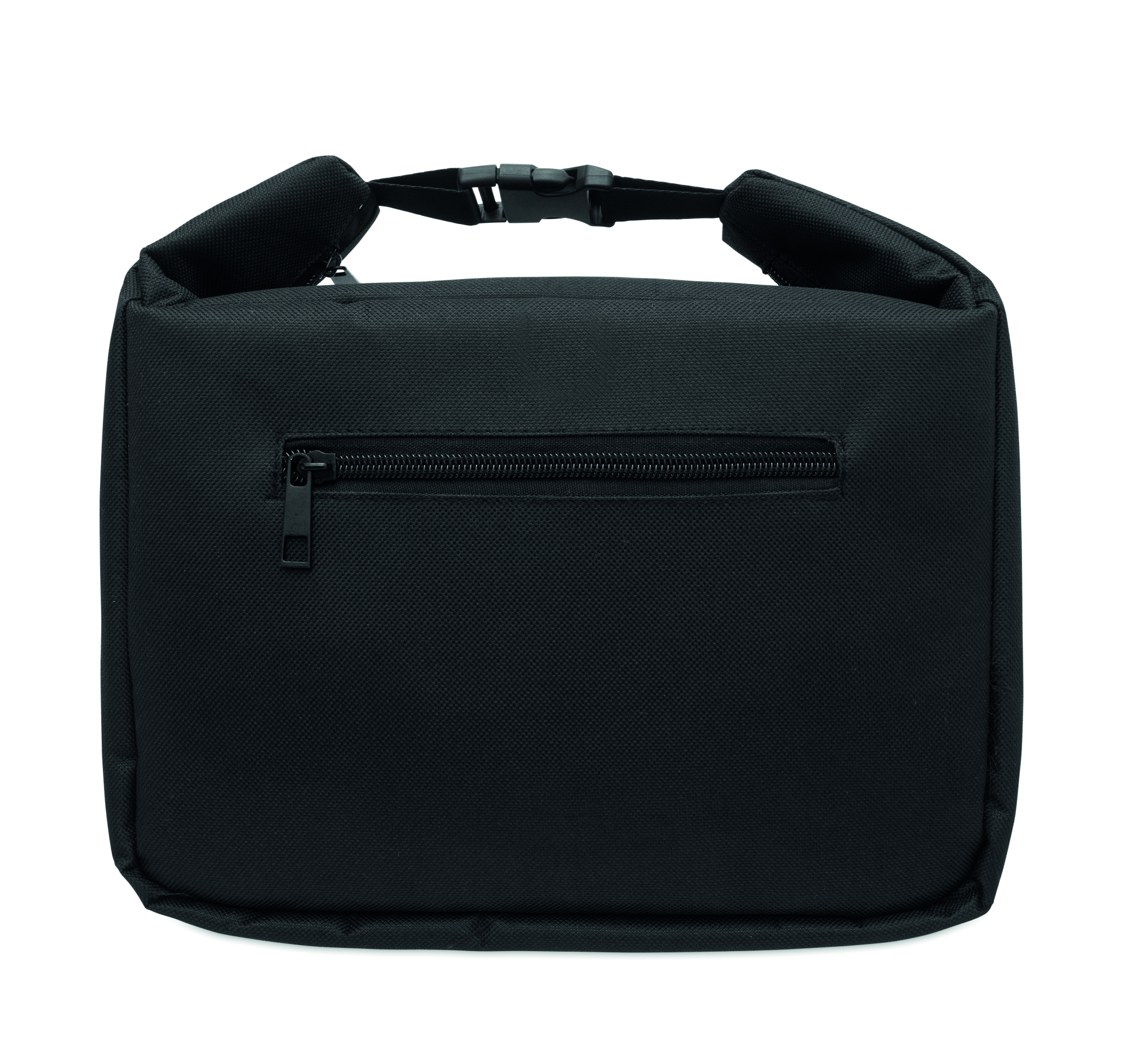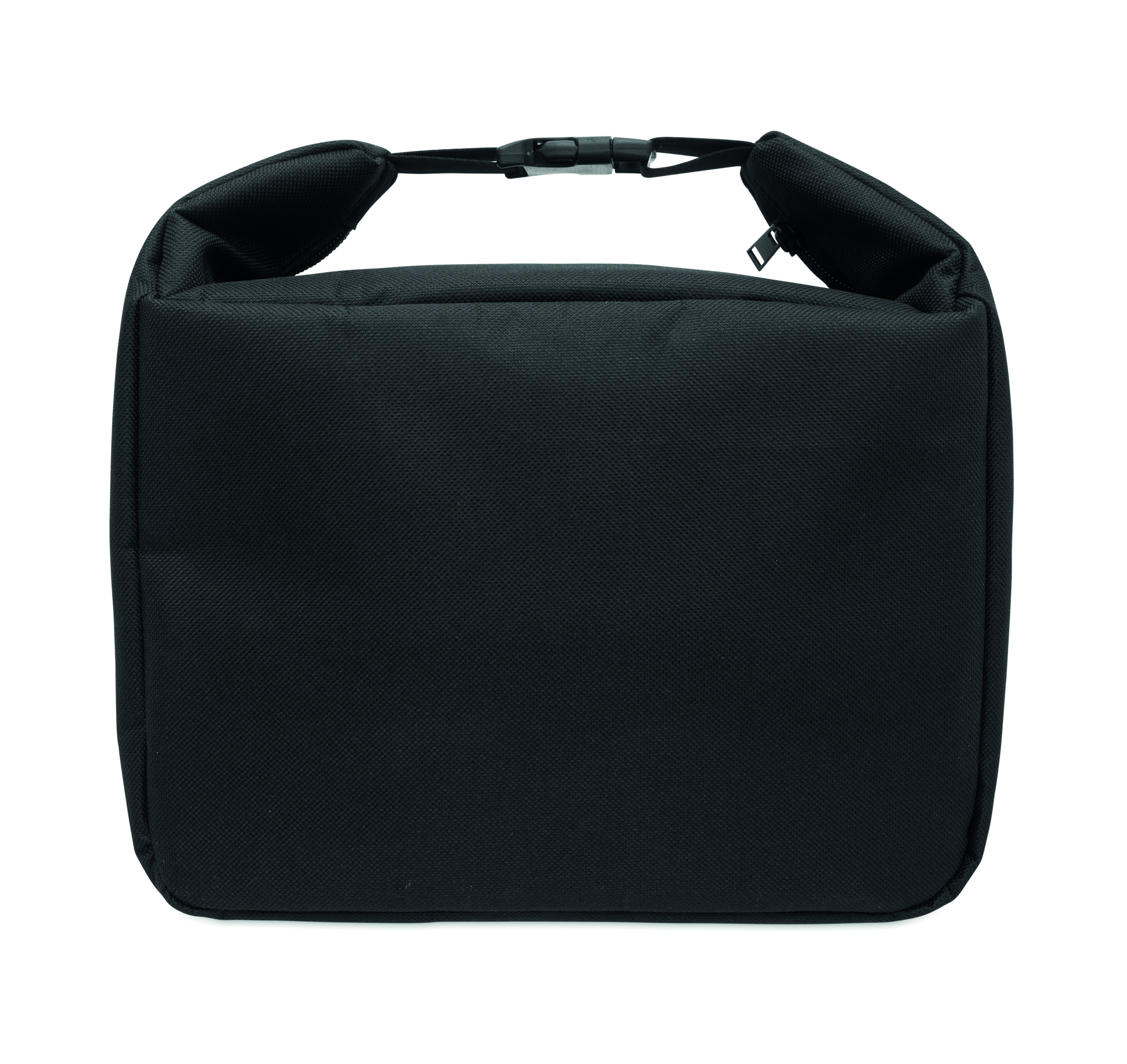 Kylmälaukku lounaalle lämpötilanäytöllä, valmistettu 600D RPETistä, 3 mm PE-vaahdolla ja alumiinifoliovuorilla. Solkilukko, vetoketjullinen päälokero ja sivutasku. Tilavuus 10 L.