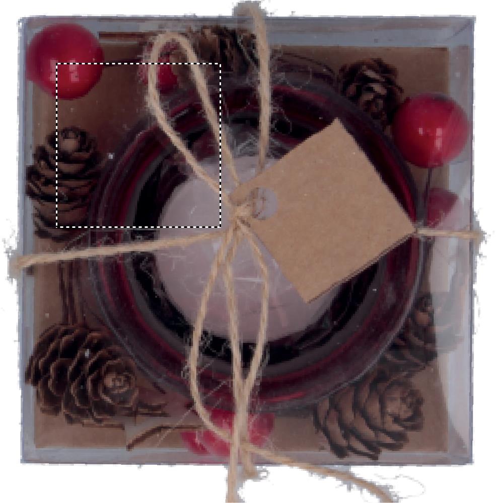 Lasinen kynttilänalunen koristeiden ympäröimänä. Pakattuna kartonki/ PVC- lahjapakkaukseen.