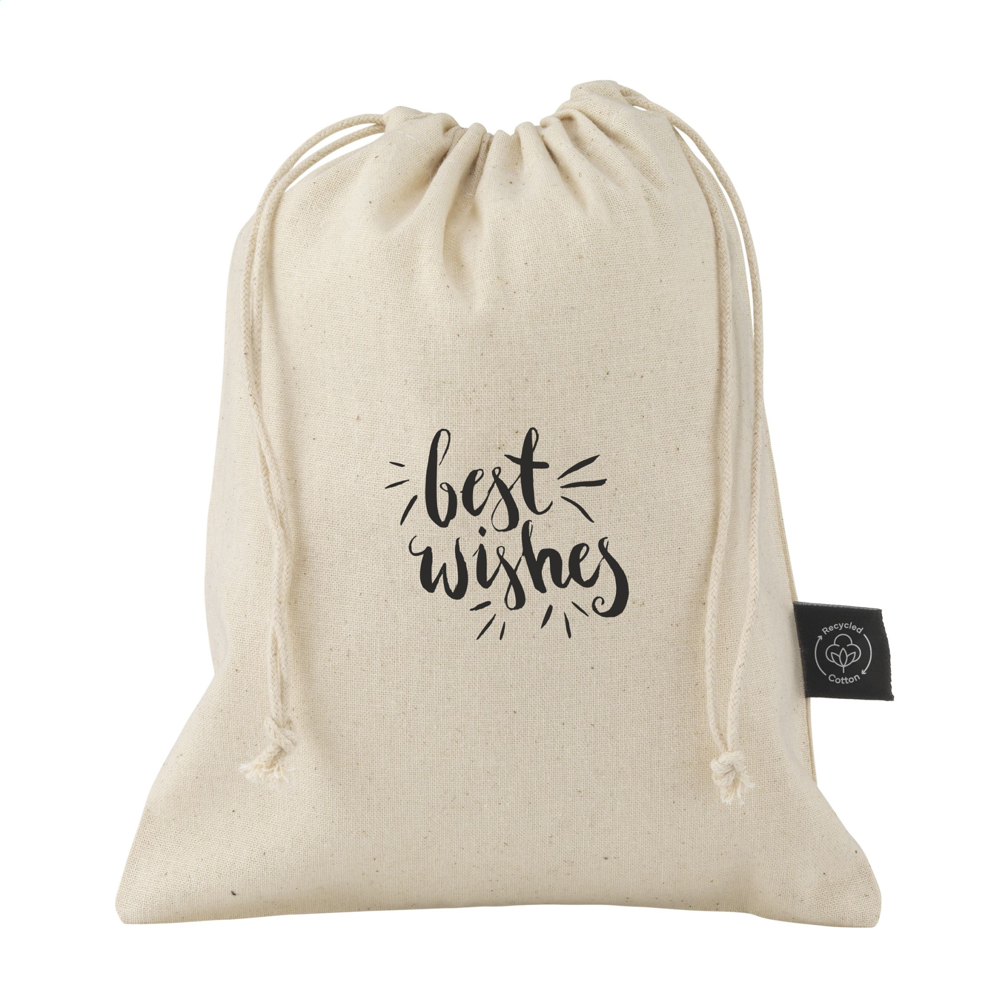 Kierrätetystä puuvillasta valmistettu lahjapussi (150 g/m²). Kiristysnyörillä, jotka on valmistettu kierrätetystä polyesterista ja kierrätetystä puuvillasta. Alkuperäinen lahjapakkaus ja sopii tavaroiden säilytykseen. GRS-sertifioitu. Kierrätysmateriaali yhteensä: 94 %. Kapasiteetti n. 500 ml.