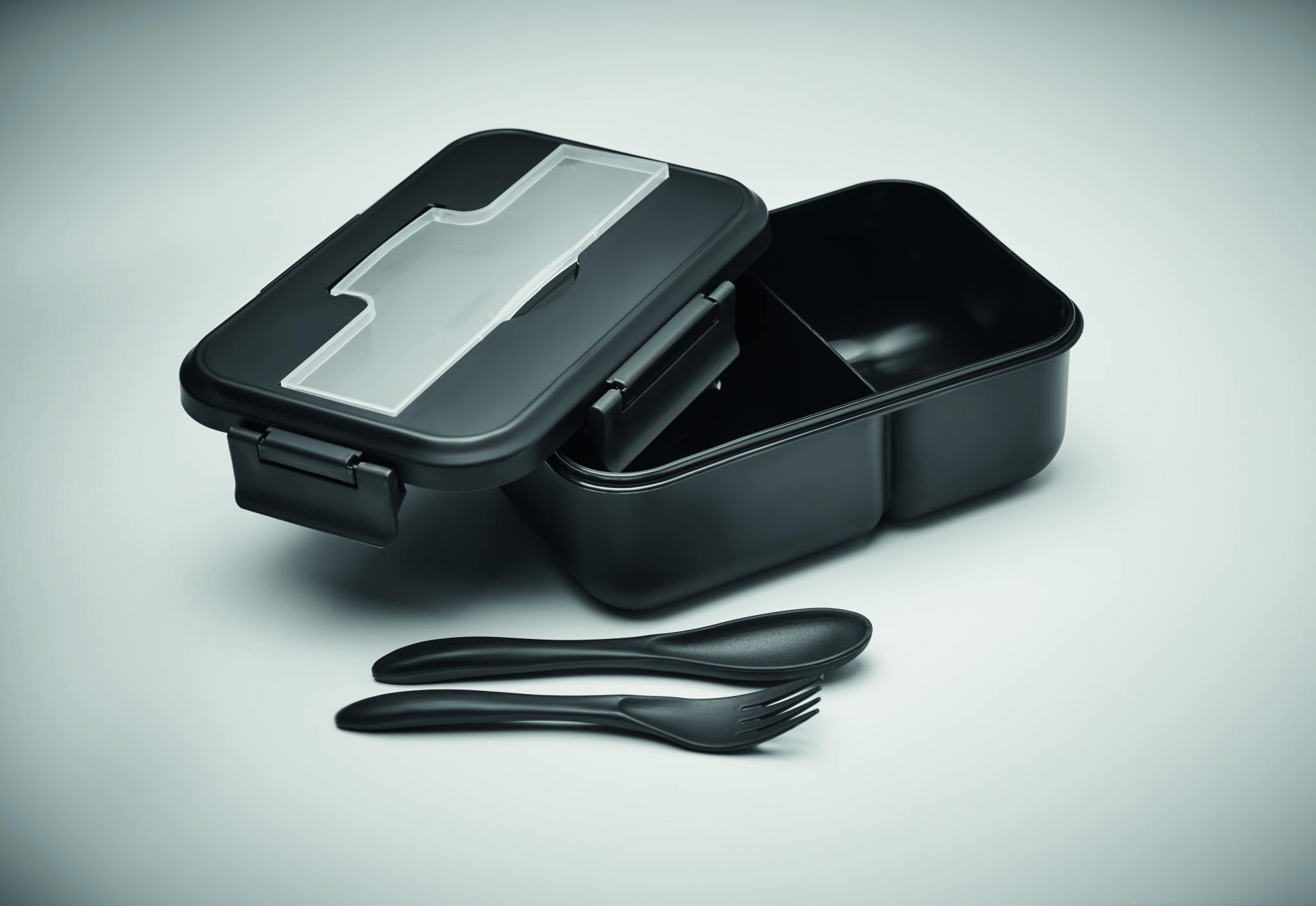 Kaksikerroksinen 1000 ml PP-lounasrasia, yhteensopivalla ruokailuvälinesetillä.