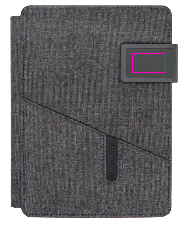 Powerbank-kansio A5 integroidulla virtapankilla (4 000 mAh), muistikirjalla (128 sivua) ja taskulla edessä. Tulo: 5V/1A - Lähtö: 5V/2.1A. Painamme logosi etupuolelle.