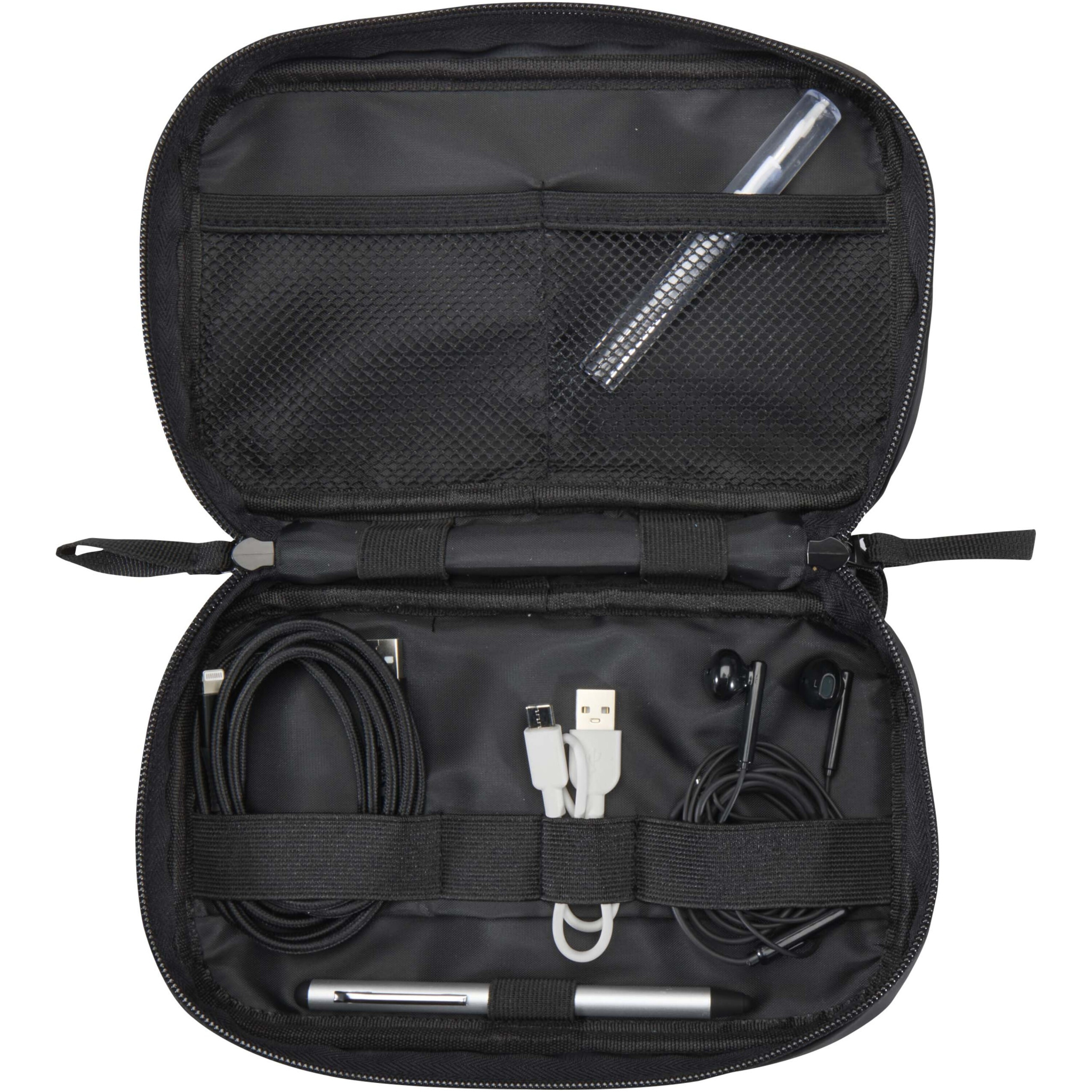 GRS-sertifioidusta ja kierrätetystä PU-nahasta sekä saman värisestä RPET-vuorista valmistettu tekniikkapussi on suunniteltu matkailijoille, etätyöntekijöille ja teknologian harrastajille. Se on kompakti ja helppo kuljettaa repussa tai käsimatkatavaralaukussa. Siinä on vetoketjullinen päälokero, jossa on käytännöllisiä järjestelyominaisuuksia, kuten joustava kynälenkki, kaksi verkkotaskua kuulokkeille ja pientarvikkeille, vahvistettu tilanjakaja ja useita joustavia lenkkejä kaapeleiden, USB-asemien ja laturien turvalliseen säilyttämiseen. Ulkopuolella on etutasku, jossa on tarranauhakiinnitys nopeaa avaamista varten, sekä kätevä kantokahva. Vedenkestävällä pinnoitteella viimeistelty pussi pitää tärkeät tavarasi suojattuina missä tahansa. Tilavuus: 1 litra.
