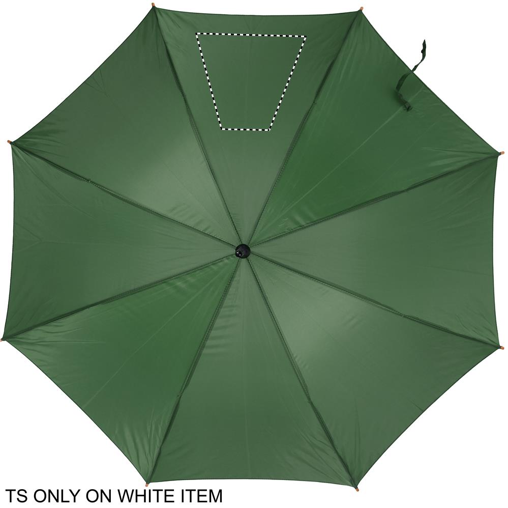 23 tuuman sateenvarjo 190T polyesteriä. Puinen varsi, kärjet ja yläosa. Mustat päällystetty metalli ruoteissa ja kaareva puukahva, automaattinen suljin.