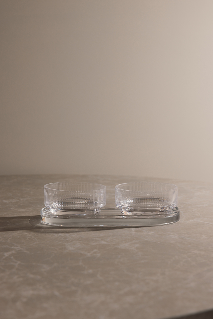 Tapas-setti ajattomalla muotoilulla ja klassisen selkeillä linjoilla. Täydellinen kaikkiin tilaisuuksiin, joissa haluat tarjoilla pieniä annoksia, naposteltavia tai lisukkeita tyylikkäästi ja elegantisti. Settiin kuuluu kaksi kulhoa ja tarjotin, joita voi käyttää yhdessä tai erikseen. Valmistettu sooda-kalkkilasista. Kulhojen tilavuus 250 ml. Konepesun kestävä.