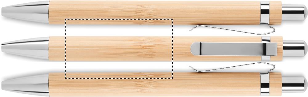 Ilgaamžis mygtuko rašiklis be rašalo su bambuko vamzdeliu ir blizgančiais chromo detalėmis. Rašiklis rašo grafito antgaliu. Bambukas yra natūralus produktas, gali šiek tiek skirtis kiekvieno gaminio spalva ir dydis, o tai gali turėti įtakos galutiniam dekoravimo rezultatui.