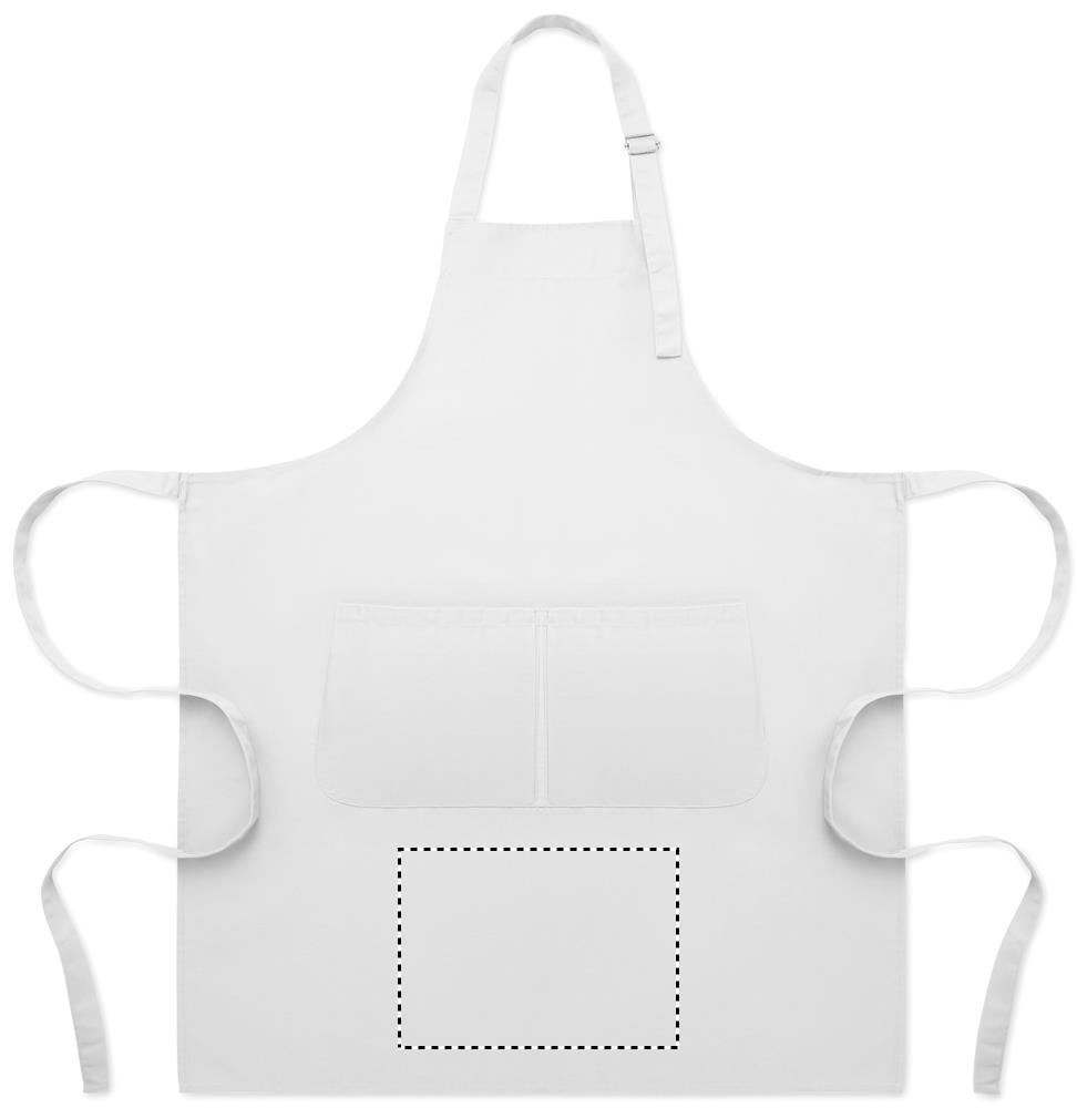 Ilga reguliuojamo aukščio virtuvinė prijuostė iš 240 g/m² polimedvilnės (35 % medvilnės, 65 % poliesterio) su dviem priekinėmis kišenėmis ir reguliuojamu dirželiu su metaline sagtimi.
