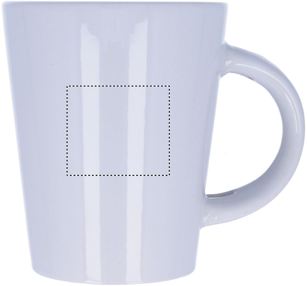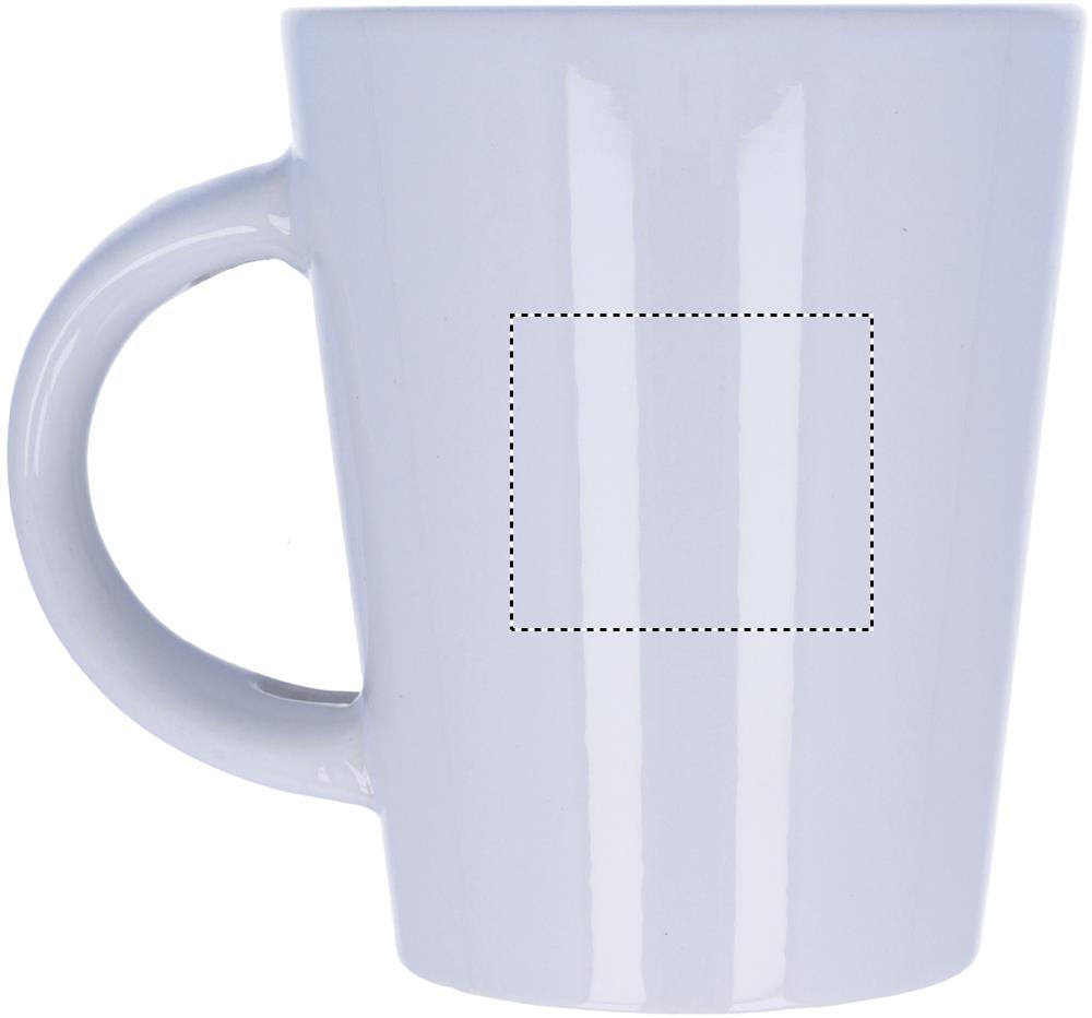 300 ml talpos akmens masės puodelis su specialia danga sublimacinei spaudai. Ant rankenos yra šaukštas. Individuali pakuotė baltoje kartoninėje dėžutėje.