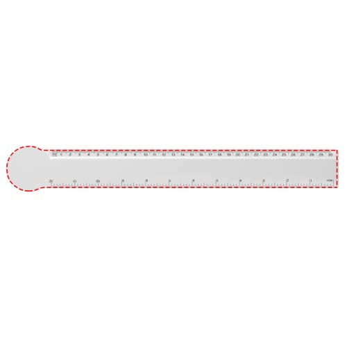 Apskritimo formos vientisa perdirbto plastiko liniuotė su ženklais coliais arba centimetrais.