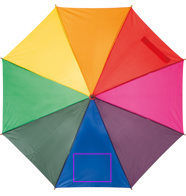 Pievilcīgs, daudzkrāsains automātiskais lietussargs ar izliektu koka rokturi. Mēs uzdrukājam jūsu logotipu uz segmenta.