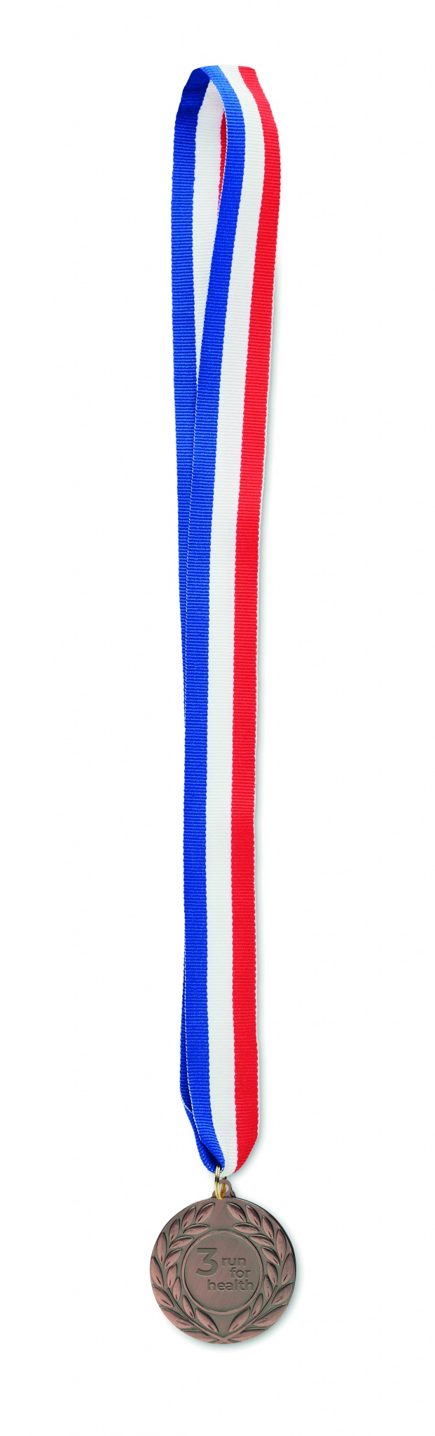 Medaļa no dzelzs ar poliestera siksniņu zilā, baltā un sarkanā krāsā. 5 cm diametrā