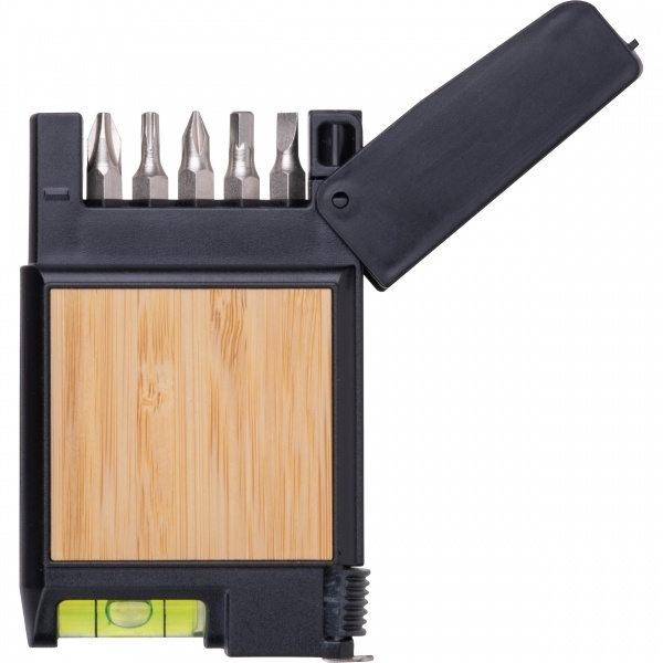 Трёхметровая рулетка из пластика с уровнем, кнопкой фиксации и пятью разными насадками. Ваш логотип нанесён на бамбуковую вставку.