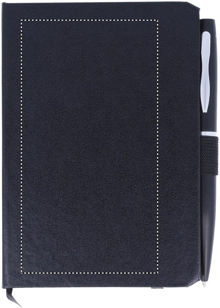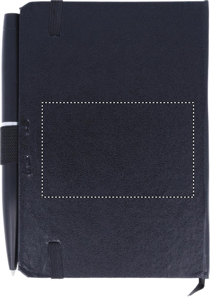Блокнот A6 с обложкой из картона, 72 линованных листа, с лентой- закладкой, перетянут резинкой. Включает металлическую шариковую ручку с синими чернилами.